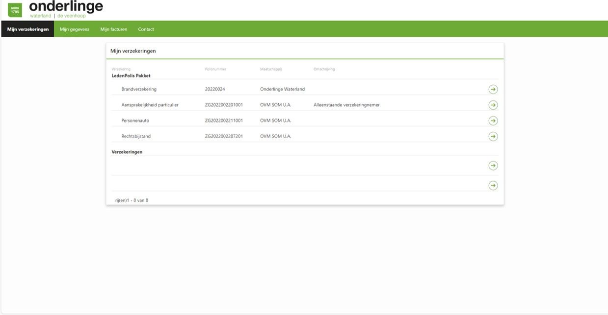 Bij het item Mijn verzekeringen ziet u al uw verzekeringen. Dit is de pagina welke u krijgt te zien wanneer u bent ingelogd.